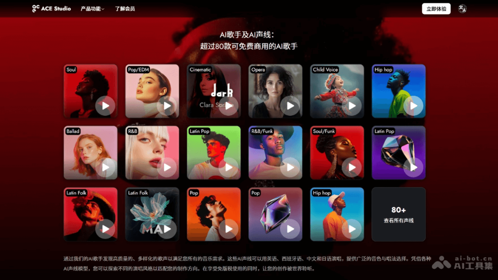 - 歌声合成:基于超过80种免费商用的AI声线,将MIDI和歌词转换成专业品质的歌声,支持多种语言和音乐风格。