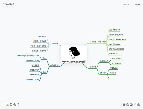 AmyMind是轻量小巧的在线AI思维导图工具,无需登录、注册、下载安装,在线打开即用,选中相应节点后鼠标右键便可AI自动生成同级节点或子节点。AmyMind支持多种文件格式,导入freemind格式、markdown文件,导出为Word、PNG、freemind和markdown文件。