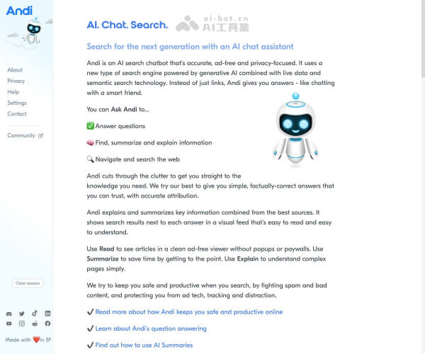 - 隐私至上:Andi AI 尊重并保护用户隐私,不会追踪用户的搜索行为,提供一个安全、私密的搜索体验。