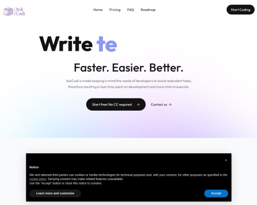 AskCodi是一个基于AI的代码生成助手,该工具理论上可以帮助你完成任何编码工作。从生成代码到解释代码背后的逻辑,从开发WordPress网站到创建一个应用程序,甚至重构你现有的代码,Codi将是你整个编码之旅的伴侣。