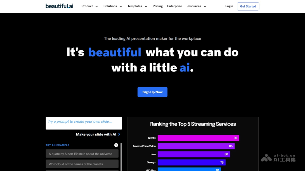 beautiful.ai 是领先的 AI 演示文稿制作工具,专为职场人士设计。beautiful.ai提供智能模板和实时设计规则,帮助用户快速创建高质量的演示文稿。beautiful.ai核心功能包括自动格式化、团队协作(共享幻灯片、内容同步更新)、品牌一致性控制以及丰富的素材库。用户能轻松实现高效设计,节省时间并提升演示文稿的美观度。beautiful.ai 适用需要快速制作专业演示文稿的企业和个人,是提升工作效率和设计质量的利器。