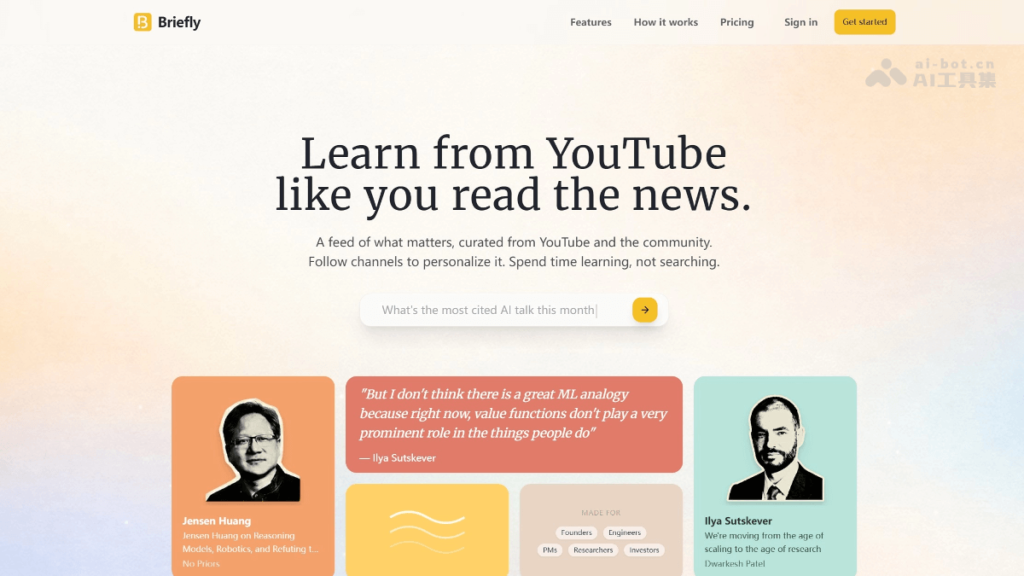 Briefly 是可以把 YouTube 直接变成学习日报的 AI 工具,只需一次性关注想学的频道,Briefly 会自动追踪新信息,用 AI 精准提取 30-90 秒原声金句,每条附带时间戳,可一键跳回完整上下文;内置语境翻译,非母语者也能秒懂专业术语;播放页可写笔记,自动归档个人知识库,支持标签检索复盘。首页每天会生成无广告的 Clips Feed,滑动速览即可掌握核心洞察,无需再被算法娱乐流打断。