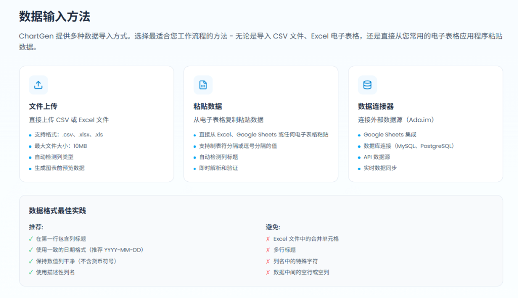 - 上传数据:将 CSV 或 Excel 文件上传至 ChartGen,也可以连接数据库或其他数据源。