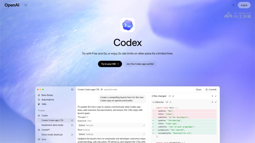 - 多平台集成与访问:用户可通过 ChatGPT 界面(Plus及以上订阅)、命令行工具(CLI)或 Visual Studio Code 扩展使用 Codex,支持与 GitHub 和 Slack 等平台集成,实现无缝任务分配与协作。