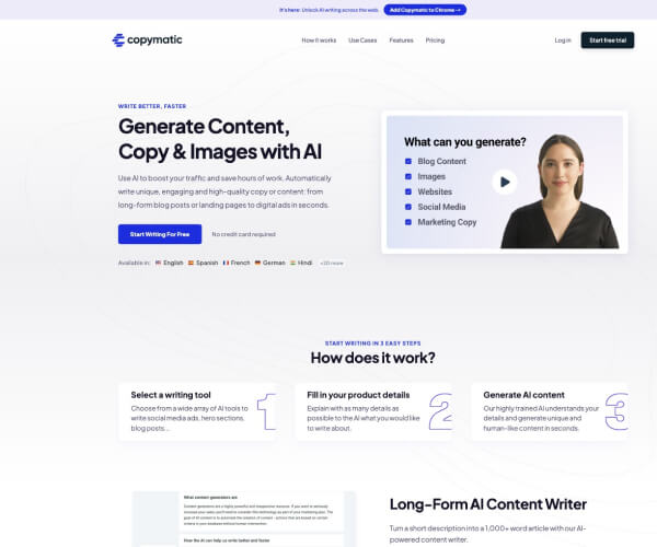Copymatic是一个人工智能驱动的AI文案和内容创作工具,只需输入标题,即可在几秒钟内自动生成原创、吸引读者且高质量的文案或内容。无论是长篇博客文章,还是网站着陆页或是数字营销广告文案,Copymatic都可以胜任。