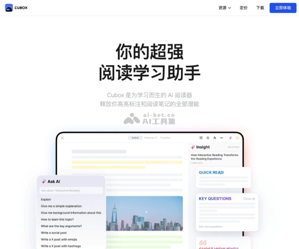 - AI 自动解读:Cubox AI 能够对用户收藏的文章/网页进行深度分析,提供文章的快速总结(快读)、关键问题摘要以及重要内容的高亮标注(幻影高亮)。这有助于用户快速把握文章的核心内容,决定是否值得深入阅读。