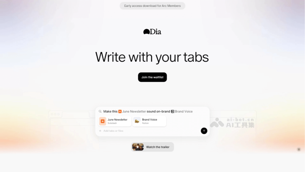 - Dia AI原生浏览器已经向所有Arc用户开放使用,如果你是新用户需要加入申请名单或他人邀请码使用。