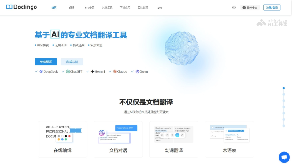 - 多格式文档AI翻译:支持PDF、TXT、Epub、Png、Office系列等多种文档格式的直接上传和翻译,保留原始排版,提供多AI引擎选择,精准高效处理图文内容,无需转换格式,一键完成跨语言文档处理。