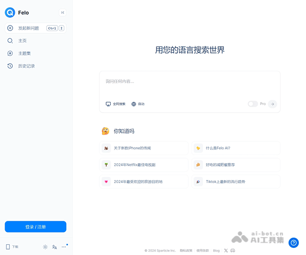 Felo是免费AI智能搜索引擎,支持社交联网搜索和多语种问答结果。用户可以自然语言提问,Felo能理解并分解问题,同时提供中文和英文搜索结果。Felo以分块形式展示答案,每块都有详细内容和来源链接。Felo还提供社交搜索、专业搜索和主题问答功能,满足不同用户的需求。Felo Pro订阅服务每月14.99美元,提供100次专业搜索和多种AI模型选择。