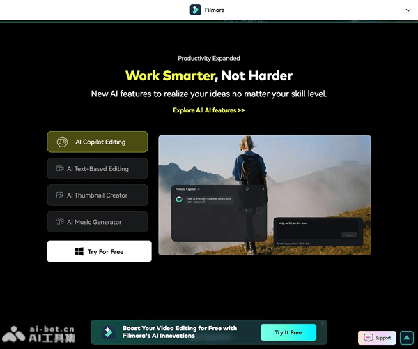 Filmora是万兴科技推出的AI视频编辑工具,Filmora提供了剪辑、合并、添加特效、转场、文本和字幕编辑等功能,适合初学者和中级视频编辑者使用。Filmora支持多轨编辑,内置大量音乐和音效资源,以及各种滤镜和动画效果。Filmora还具备一些高级功能,如颜色校正、音频编辑和关键帧动画,能满足更专业的视频制作需求。Filmora支持多种视频格式,便于用户导入和导出视频项目。