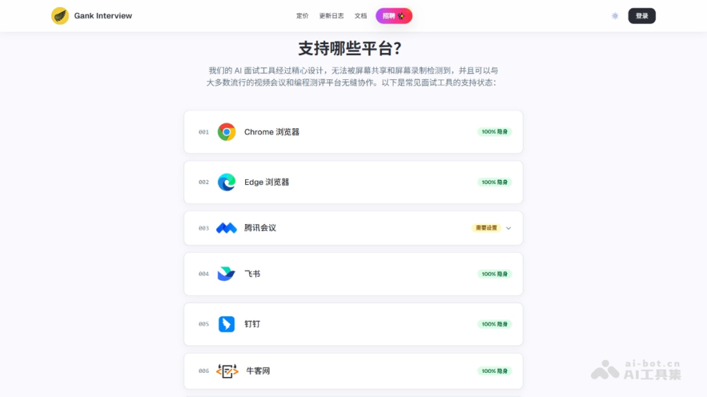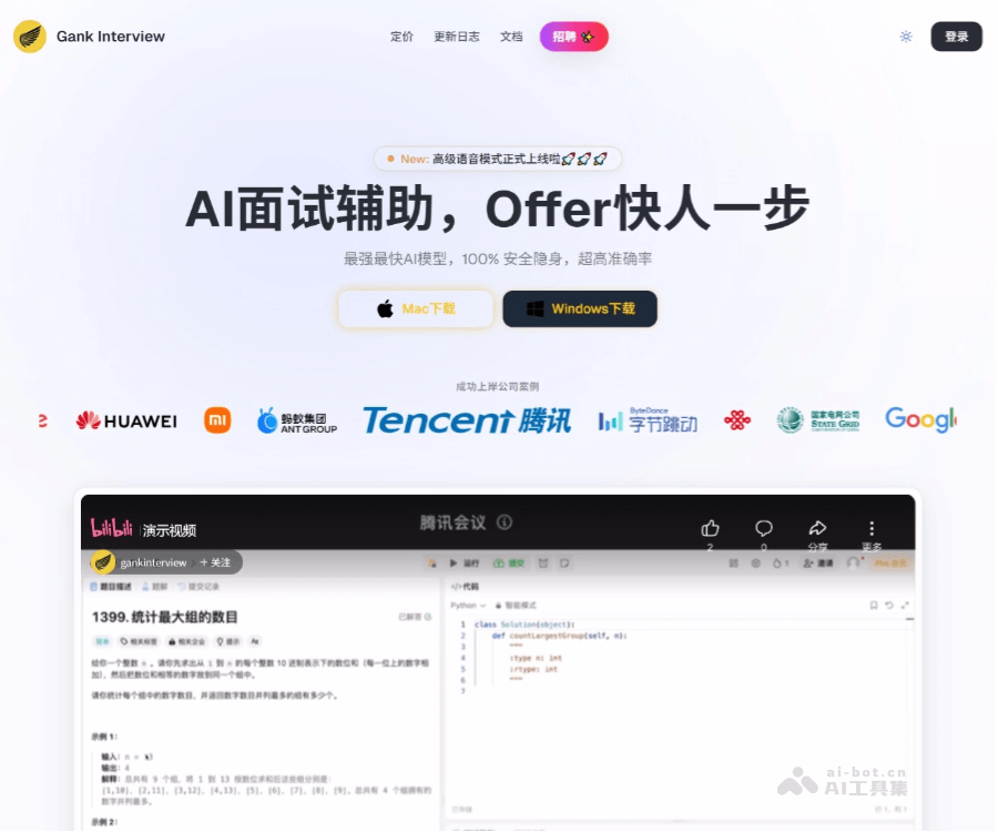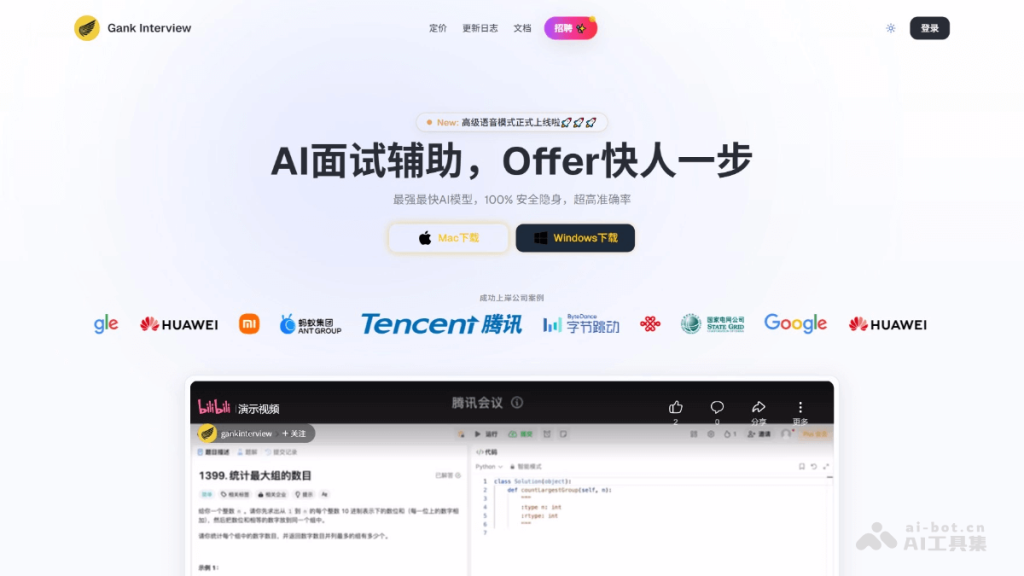 Gank Interview 是AI智能面试助手,专为笔试和面试设计的 AI 桌面应用程序。Gank Interview支持截屏模式和语音模式,能快速生成笔试答案或实时识别面试官问题并提供解答。Gank Interview支持多种编程语言和中英文,能在主流面试平台如 Chrome、Edge、腾讯会议、Zoom、LeetCode 等中完全隐身,躲避反作弊检测,帮助用户高效应对技术面试和笔试场景。