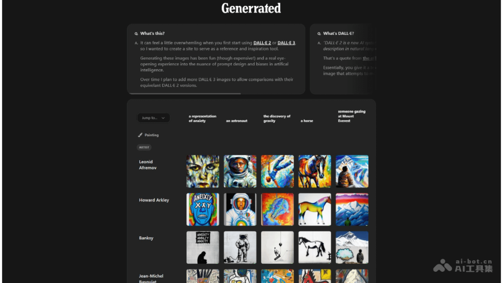 Generrated 是为 DALL·E 2 和 DALL·E 3 用户提供参考与灵感平台。Generrated展示超过 9,300 张由 AI 绘图工具生成的图像,附带生成图像所用的文本提示。用户点击图像能查看提示用语,还能浏览同一提示生成的所有图像,对比不同版本的风格差异。Generrated 帮助新手快速了解如何设计有效提示,减少试错成本,是学习和探索 AI 绘图的实用工具。