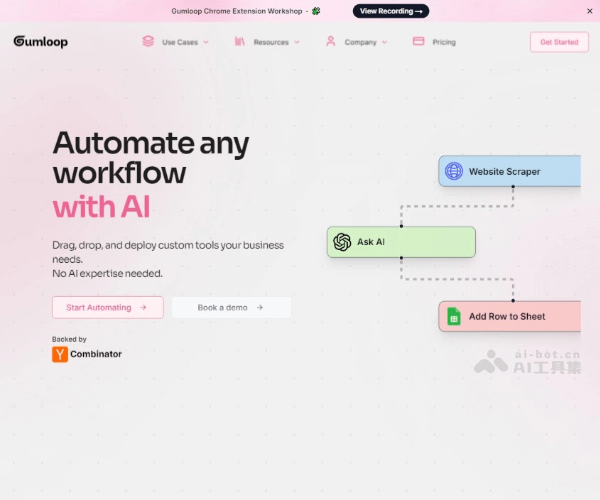 Gumloop是AI零代码工作流平台,通过简单的拖放界面使用户能够创建和部署 AI 驱动的工作流自动化,无需编写代码。核心优势在于易用性和强大的 AI 功能,适合非技术用户快速上手,设计和实施复杂的自动化流程。Gumloop 提供了预定义的自动化模板,支持与多个流行服务的连接,如 Twitter、AWS、GitHub、Outlook、Google 等,支持用户自定义工作流程。Gumloop 提供了 Chrome 扩展程序,用于构建 AI 浏览器自动化。