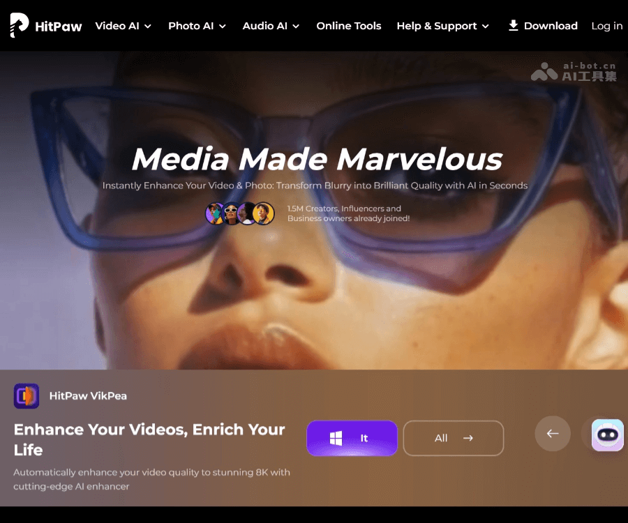 | HitPaw VikPea (原 Video Enhancer) | 通过AI模型修复和增强视频画质,例如将模糊视频变清晰、为黑白视频上色、提升分辨率至4K/8K等。 |