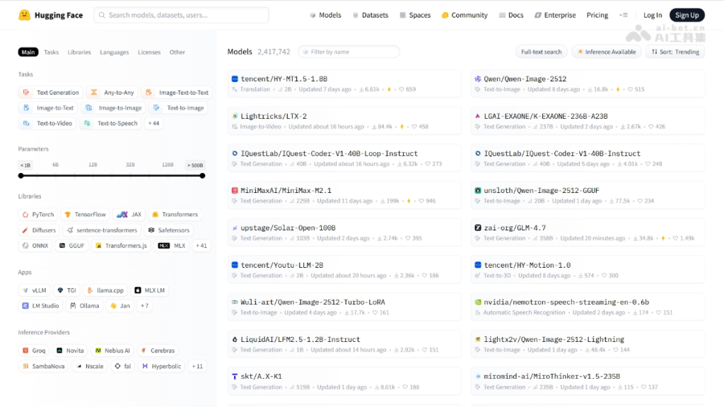 - 开源工具库:提供 Transformers、Datasets、Tokenizers 等开源工具,支持快速开发和部署 AI 模型。