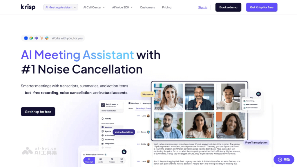 Krisp是人工智能驱动的音频处理软件,提升通话和会议的语音质量。通过先进的AI技术,能实时消除背景噪音和人声干扰,让通话更加清晰。Krisp支持双向降噪,能消除你听到的噪音,能确保对方听不到你的背景杂音。具备人声分离功能,能突出主讲人的声音,让会议记录更加准确。Krisp提供会议转录和摘要功能,支持多种语言,帮助用户快速整理会议内容。最新版本增加了口音转换功能,能将不同口音的语音转换为标准发音,进一步提升沟通效率。Krisp适用于多种场景,包括远程办公、在线会议和播客制作等。支持Windows、Linux、Mac、Android和iOS等多种操作系统,确保用户在不同设备上都能使用。