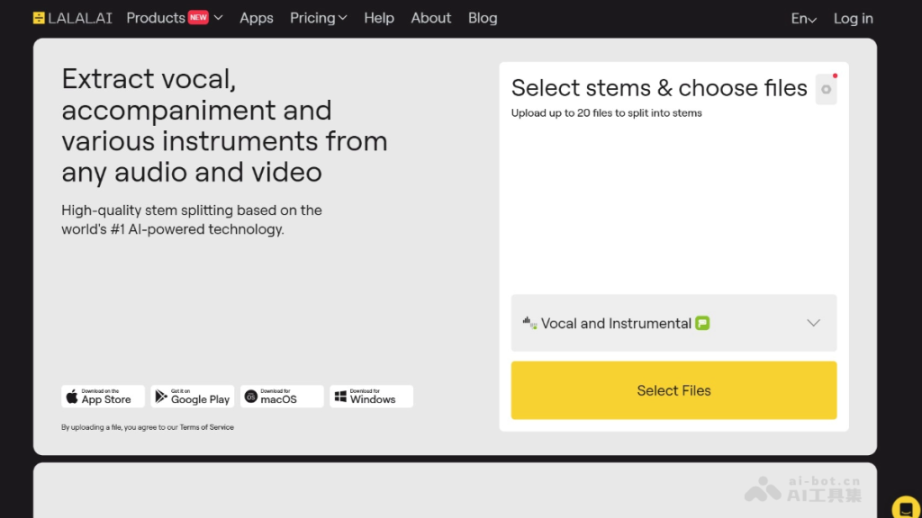 - 上传文件:在首页点击“Select stems & choose files”按钮,选择需要处理的音频或视频文件,支持多种格式(如 MP3、WAV、MP4 等),可一次性上传多达20个文件进行批量处理。