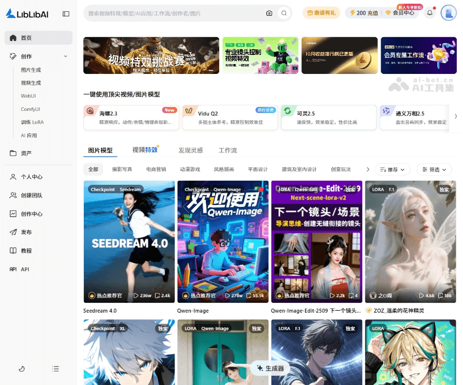 LiblibAI 是一站式 AI 内容创作生成平台,提供图片生成、视频生成、视频特效和资产管理等功能。LiblibAI整合顶级 AI 模型,如混元 3.0、海螺 2.3、通义万相 2.5等,将图像、视频、灵感、AI应用、模型训练5大模块一站打通。LiblibAI拥有丰富的社区生态,创作者能获取灵感、分享作品,支持通过“做同款”功能快速复刻优秀创意。LiblibAI 降低了创作门槛,简化操作流程,减少工具切换,让创作更高效、更自由,是创作者在 AI 时代提升效率、激发创意的理想选择。