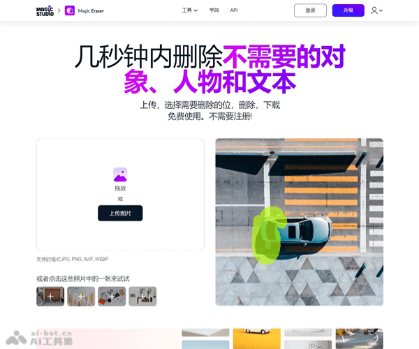 - 上传图片:访问Magic Eraser官网(magiceraser),通过拖放或点击选择的方式上传您想要编辑的图片。支持的图片格式包括JPG、JPEG、PNG、HEIC、WEBP、TIFF等,且对上传图片的分辨率没有限制。