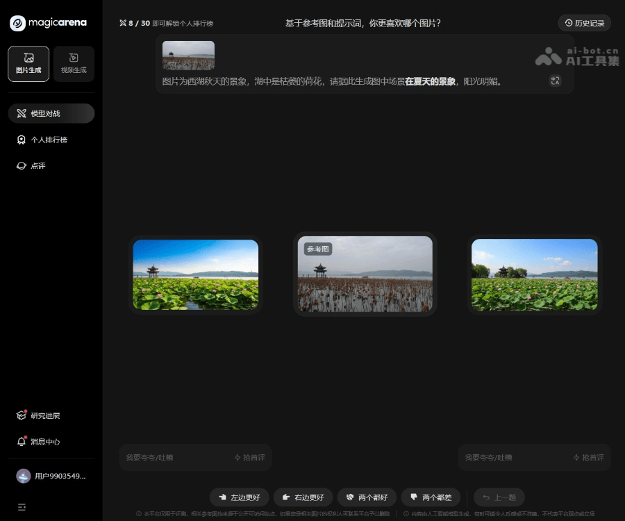 - 比较与投票:对比生成结果后,选择“左边更好”“右边更好”“两者都好”或“两者都差”投票。