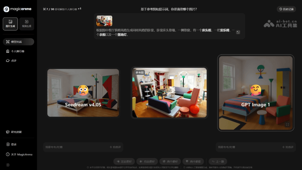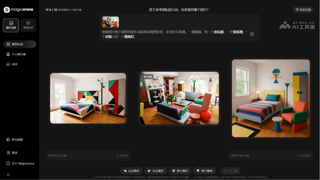 - 切换竞技场:点击右上角按钮,切换到图片或视频生成竞技场。