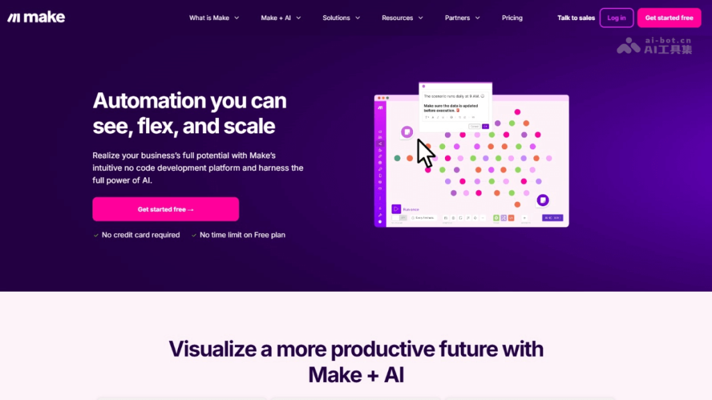 Make是AI零代码自动化工作流搭建平台,帮助企业提升效率和创新。Make提供超过2000个预建应用,支持多种业务场景,如营销、销售、财务等。Make的核心功能包括Make + AI、AI智能代理(Make AI Agents)及企业级自动化解决方案。Make支持数据安全和合规性,是企业实现数字化转型和流程优化的理想选择。
