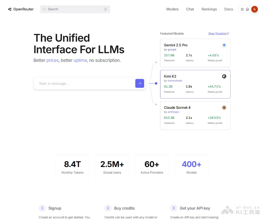 - 统一 API 接口:提供一个统一的 API 端点,访问 400 多个 AI 模型,简化开发流程。