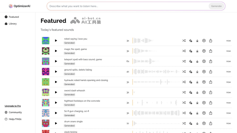 - 文本到声音效果生成:Optimizer AI可以根据用户的文字提示生成各种声音效果,适用于不同的场景和应用,如游戏中的射击声、跳跃声,动画中的环境音效等。