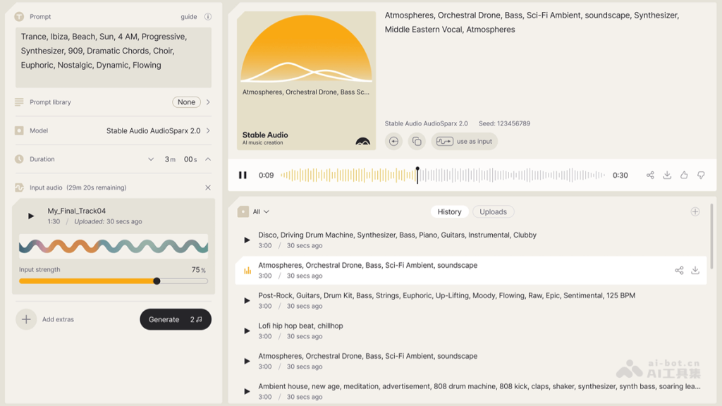 StableAudio 是Stability AI 提供的AI音乐创作平台。平台通过文本生成音乐(Text-to-Audio)和音频生成音频(Audio-to-Audio)的方式,用户只需输入文字描述或上传音频素材,能生成符合要求的音乐。平台支持生成长达3分钟的音频,格式为44.1kHz立体声。平台生成的音乐能用在商业项目。平台适合音乐创作者、制作人及对音乐创作感兴趣的普通用户。