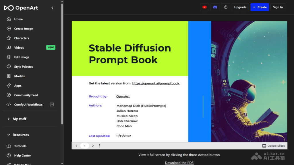 - 下载手册:访问OpenArt官网,下载《Stable Diffusion Prompt Book》的PDF版。