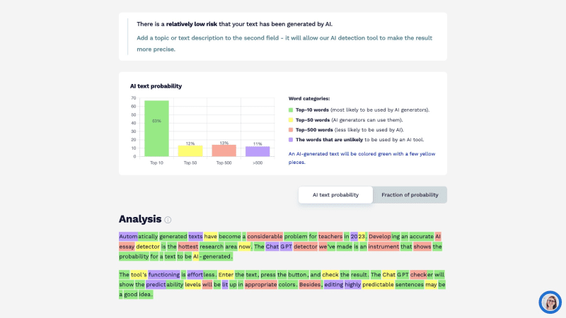 - 详细单词统计分析,单击每个单词,可以看到AI聊天机器人使用该单词的概率。