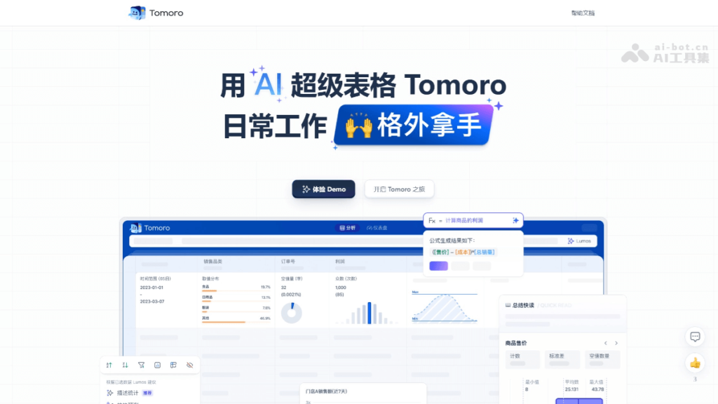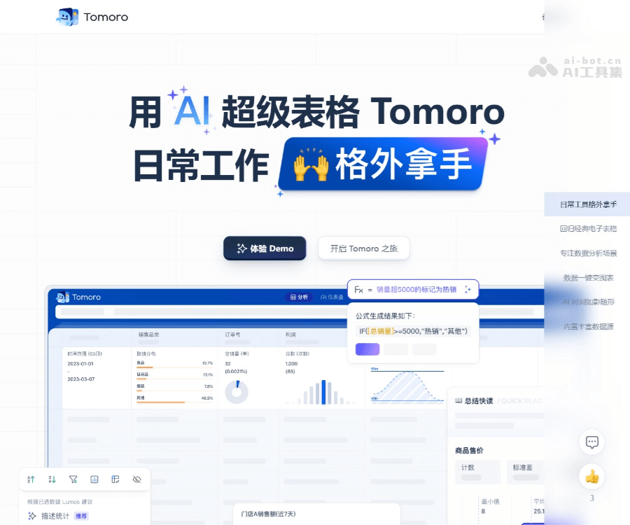 - 函数公式智能适配:无需掌握专业查询语言(SQL、Python 等),用函数公式能轻松定义数据列的内容。Tomoro 已适配支持日常 Excel 常用函数,比如AND、SUM、IF、DATE、VLOOKUP等,会持续补充更多常用的 Excel函数外,贴近大家的业务分析场景,新增 Tomoro专属函数。