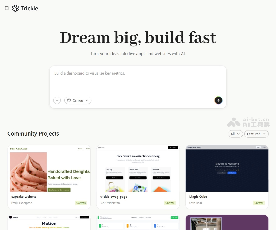 Trickle AI 是一站式无代码 AI 开发平台,支持将自然语言描述快速转化为功能强大的应用程序、网站和表单。Trickle 的核心是Magic Canvas,一个完全可视化的画布,支持与 AI 实时协作。Trickle AI 内置轻量级数据库、设计模板、自定义域名和网站托管功能,支持拖拽操作,用户能轻松实现创意。Trickle AI 提供社区项目参考,帮助用户获取灵感,快速构建原型并进行市场验证。Trickle AI为人开发者和企业用户,高效实现项目目标,节省时间和精力,快速将想法转化为实际应用。