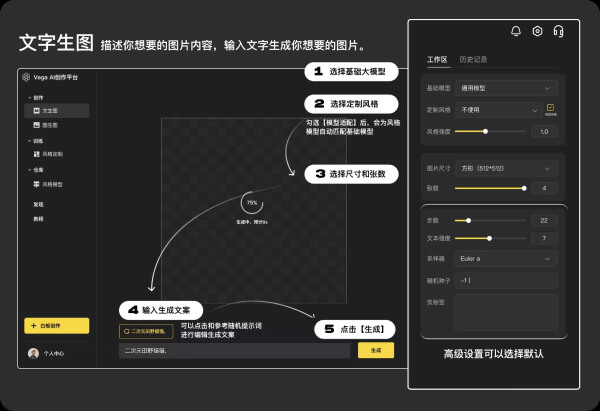 - 文生图:输入文本提示描述,选择风格,即可快速生成高质量图像