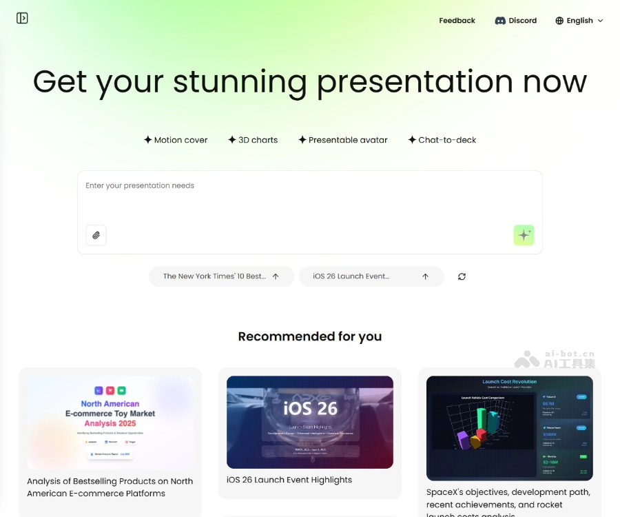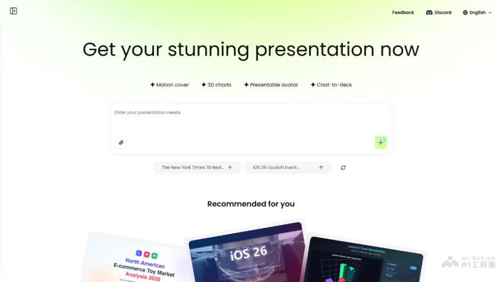 - 电影级视觉效果:AI 能将文字提示转化为动态演示文稿,无需设计技能,用电影级视觉画面抓住观众注意力。
