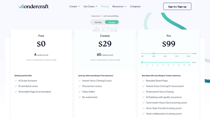 - Free免费版:用户每月可免费获得4个积分,每个积分可以生成1分钟的音频。免费计划包括AI脚本助手、10种标准声音以及一个非品牌的可分享页面。